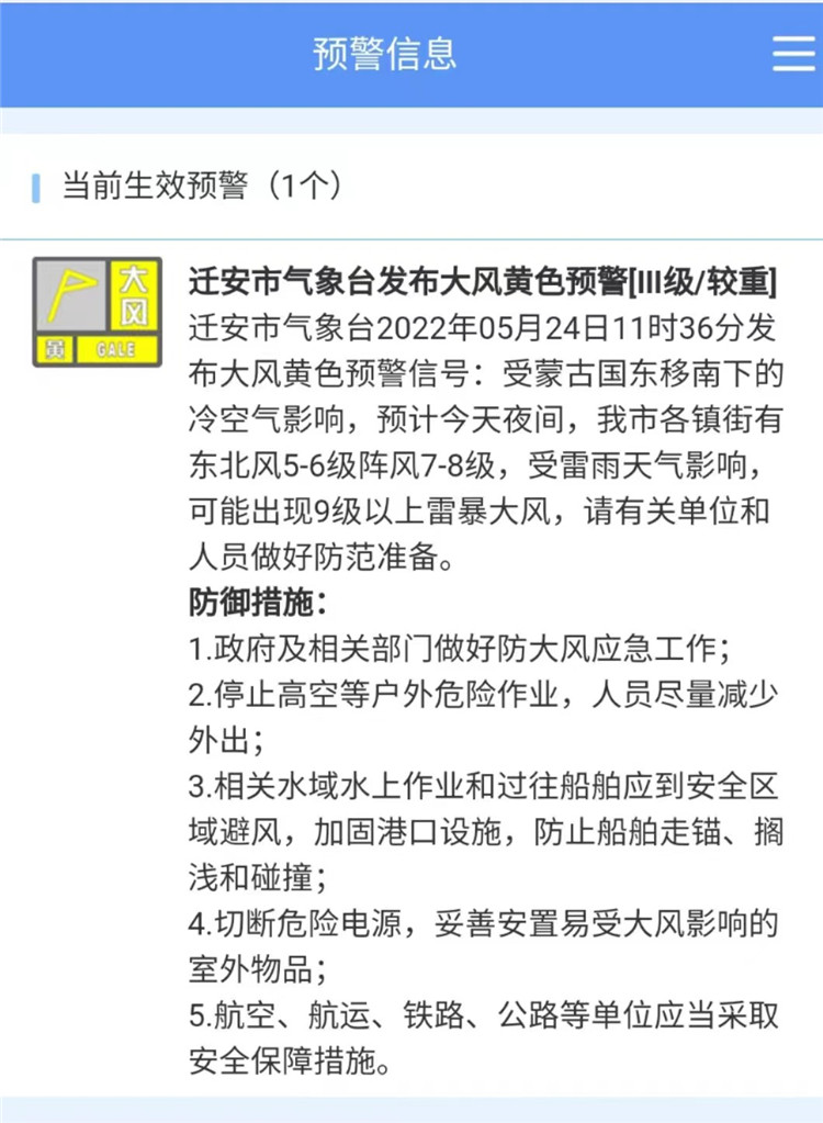 遷安市氣象臺2022年5月24日11時36分發(fā)布大風黃色預警信號:受蒙古國東移南下的冷空氣影響,預計今天夜間,遷安市各鎮(zhèn)街有東北風5-6級陣風7-8級,受雷雨天氣影響,可能出現(xiàn)9級以上雷暴大風,請有關(guān)單位和人員做好防范準備。