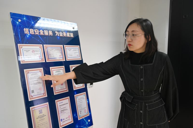 圖為11月6日,唐山啟奧科技股份有限公司董事會秘書楊曉麗介紹公司取得的服務(wù)資質(zhì)。郭寶強(qiáng)攝