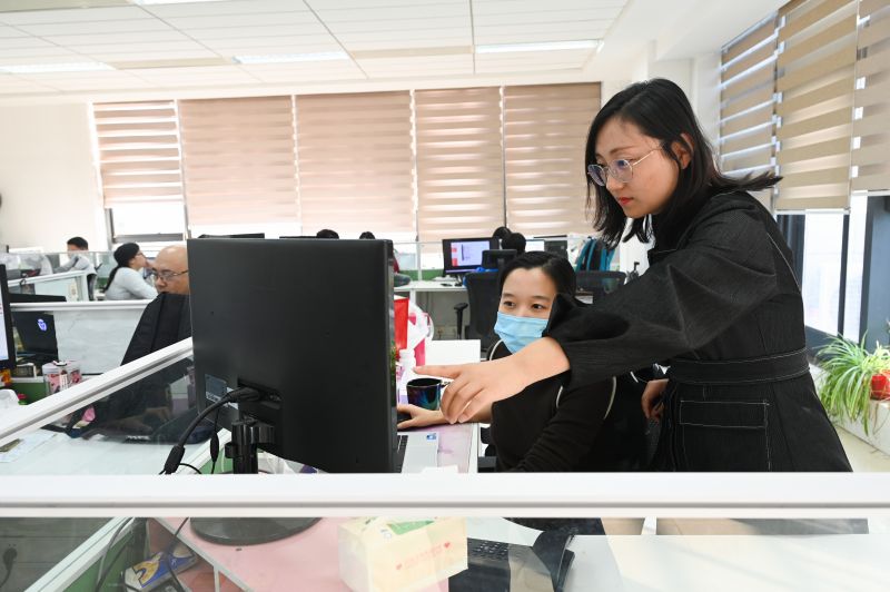 圖為11月6日,唐山啟奧科技股份有限公司董事會秘書楊曉麗與同事交流工作。郭寶強(qiáng)攝
