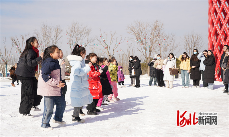 圖為大學(xué)生在唐山花海冰雪樂園與小朋友們一起嬉戲。