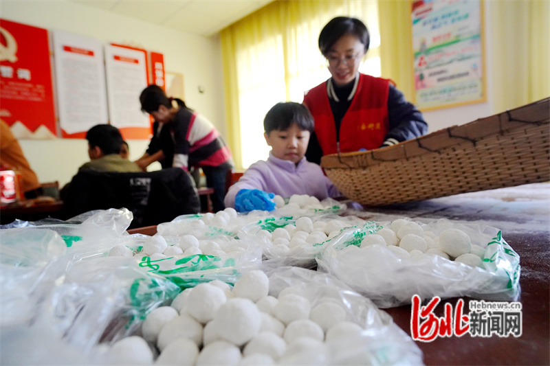圖為活動現(xiàn)場工作人員與孩子們一起分揀元宵。通訊員侯亞婷攝