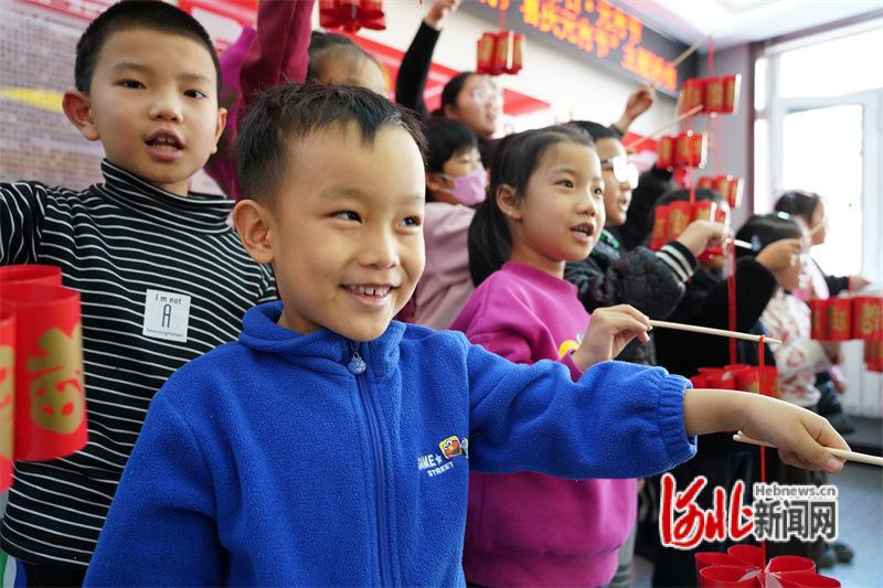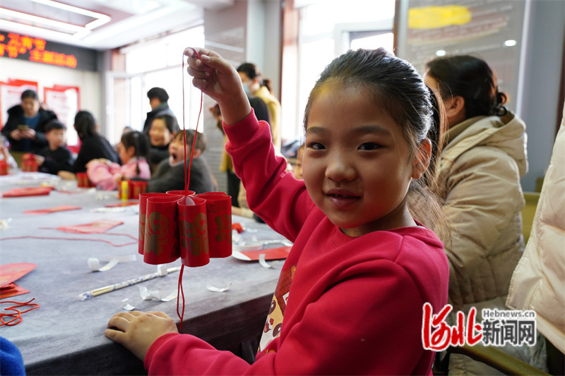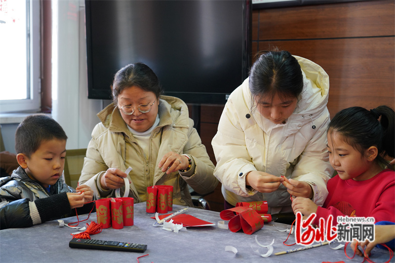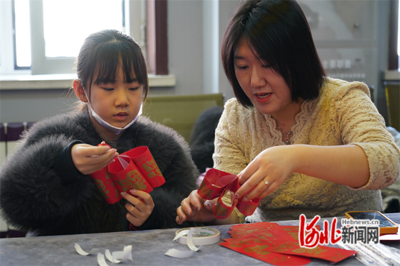 圖為2月23日活動(dòng)現(xiàn)場,巾幗志愿者教孩子們制作“紅包花燈”。