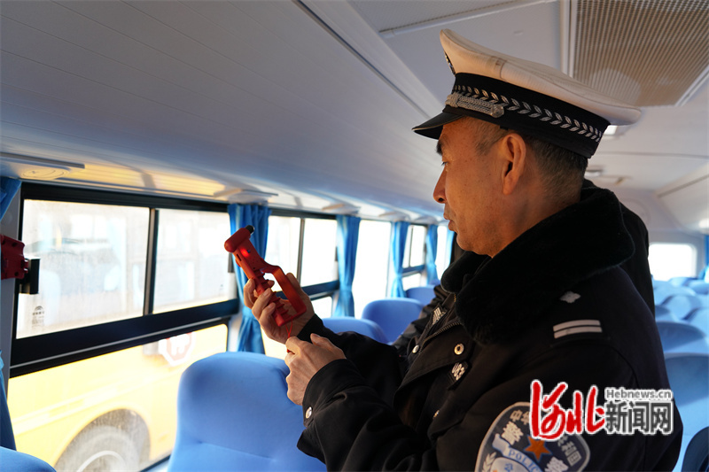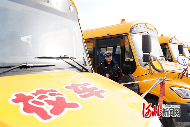 圖為2月23日,唐山市公安局交通警察支隊(duì)六大隊(duì)交警對(duì)校車進(jìn)行安全檢查。