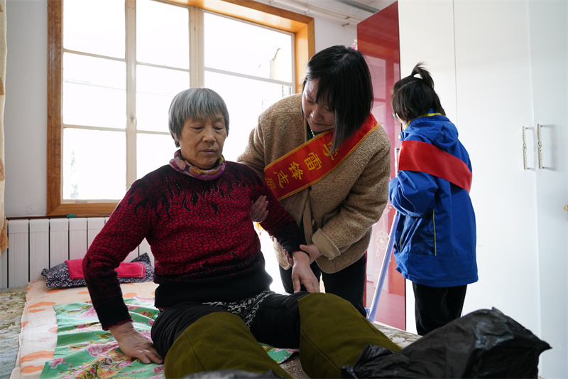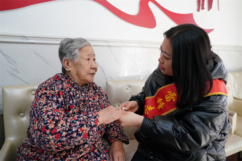 圖為唐山市開平區(qū)馬家溝街道新華社區(qū)志愿者走進(jìn)養(yǎng)老院,為老人剪指甲,陪老人聊天。