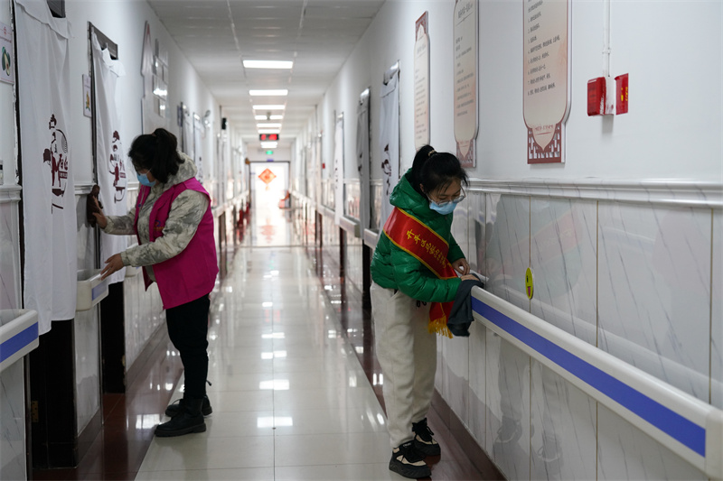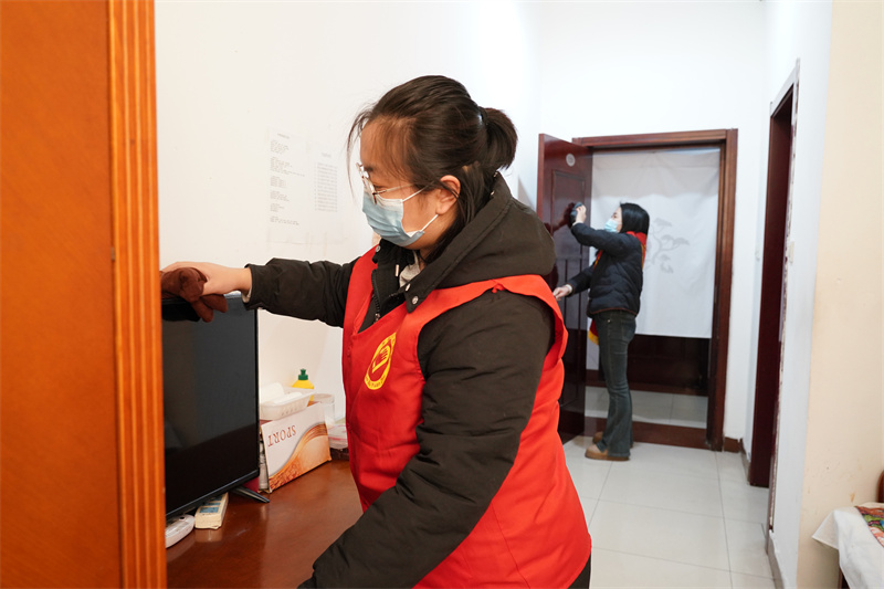 圖為社區(qū)志愿者走進(jìn)養(yǎng)老院,幫老人整理內(nèi)務(wù)、做衛(wèi)生。