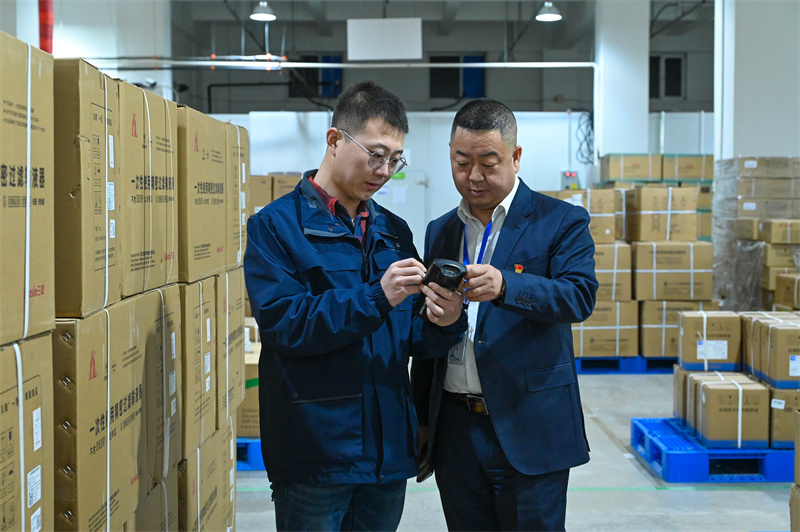 圖為3月11日,李占峰(右)通過物流平臺掃碼設(shè)備了解醫(yī)療器械的詳細(xì)信息。郭寶強(qiáng)攝
