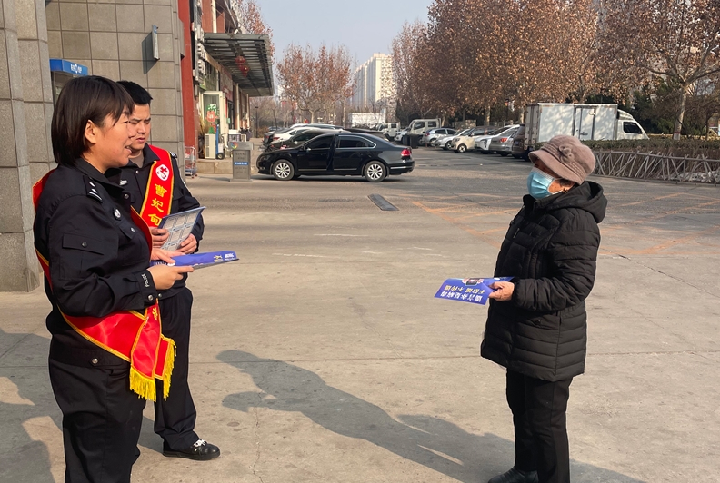 圖為唐山市曹妃甸區(qū)公安局網(wǎng)安支隊民警向居民發(fā)放宣傳資料。通訊員王亞軍攝