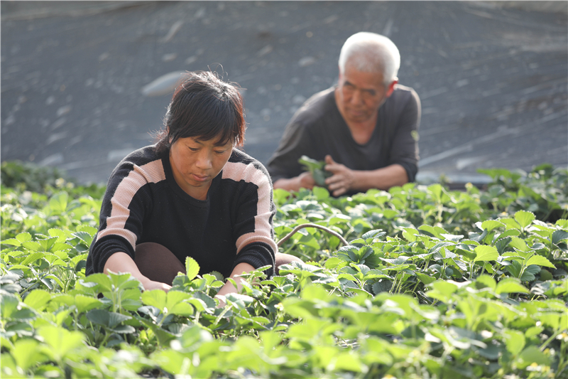 農(nóng)民在臨城縣黑城鎮(zhèn)草莓采摘園管護(hù)草莓。