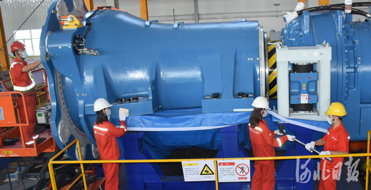近日,邢臺(tái)金風(fēng)科技有限公司工人正在檢查風(fēng)力發(fā)電機(jī)組軸系。