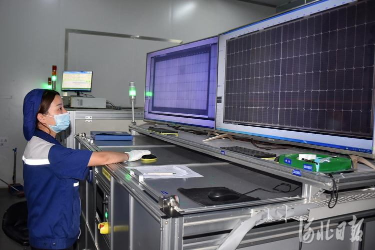 晶澳(邢臺(tái))太陽(yáng)能有限公司工人正在對(duì)光伏組件的電池片進(jìn)行掃描檢查。