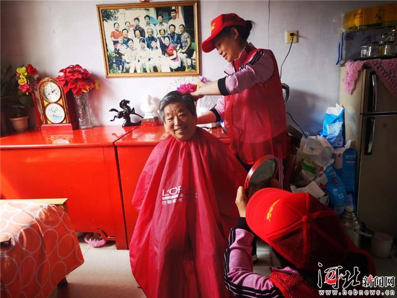 圖為下花園區(qū)煤礦街道新開街社區(qū)志愿者為老人義務(wù)理發(fā)。