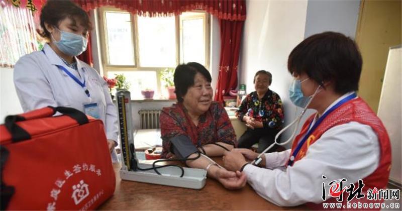 圖為下花園區(qū)煤礦社區(qū)衛(wèi)生服務(wù)中心醫(yī)務(wù)人員為新開街社區(qū)老人測量血壓。