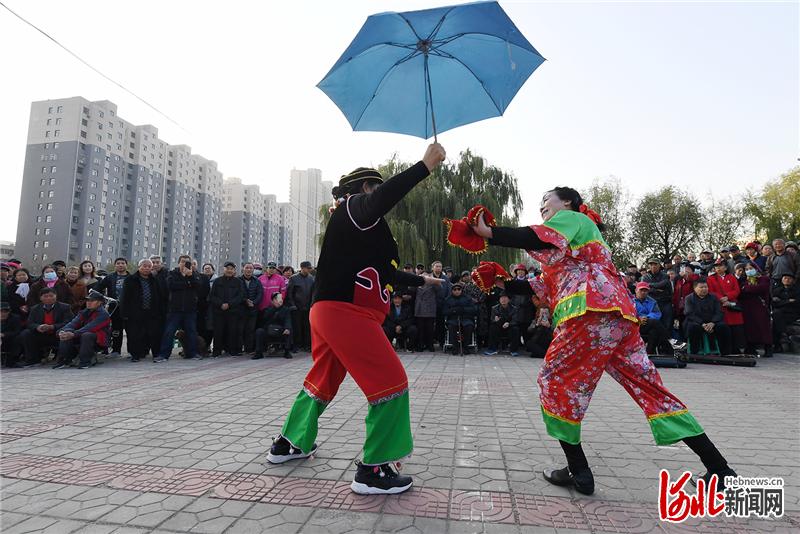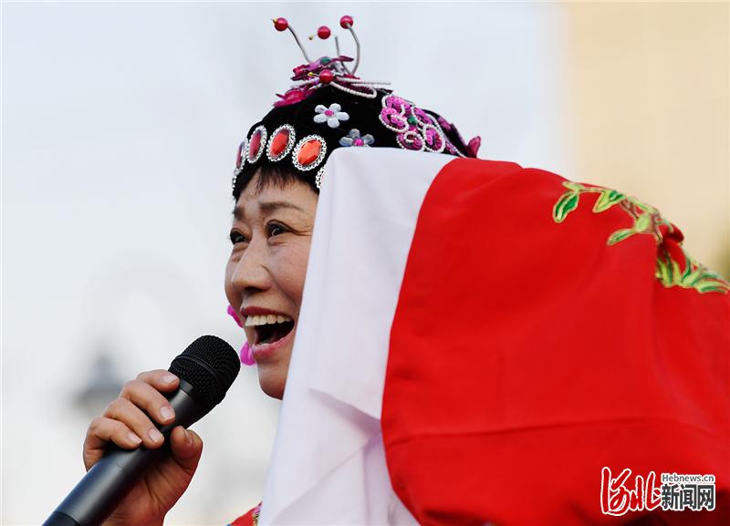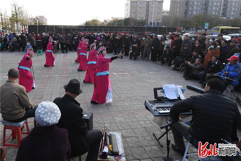 圖為初冬時(shí)節(jié),河北省懷來縣戲迷愛好者在濱河公園戲曲驛站自?shī)首詷费莩獞蚯?/p>