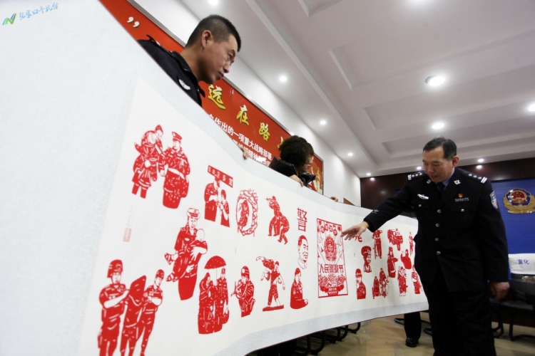 張家口市交警支隊宣化一大隊民警宋建國從警16年,擅長繪畫和剪紙的他平日喜歡將警察工作描繪下來。為迎接1月10日首個“中國人民警察節(jié)”的到來,宋建國利用2個多月的業(yè)余時間創(chuàng)作出《警魂》剪紙長卷和100多件單幅《祖國萬歲·中國人民警察節(jié)》作品,充分展現(xiàn)人民警察昂揚向上的精神風貌和身為人民警察的自豪。圖為宋建國(右一)展示他制作的《警魂》剪紙長卷。陳曉東、王瑋、梁濤攝影報道