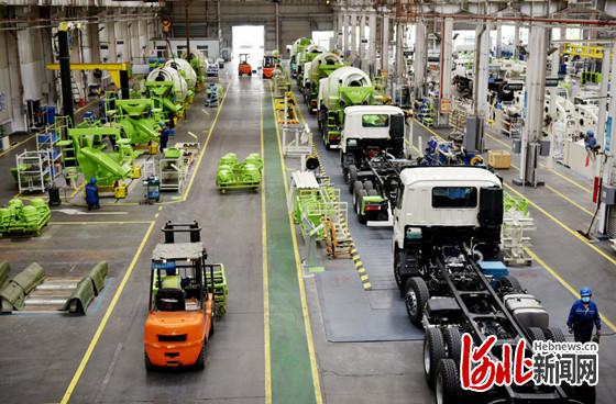 圖為張家口市宣化經(jīng)濟(jì)開發(fā)區(qū)的北汽福田宣化雷薩泵送機(jī)械廠工人在起重機(jī)組裝生產(chǎn)線上工作。