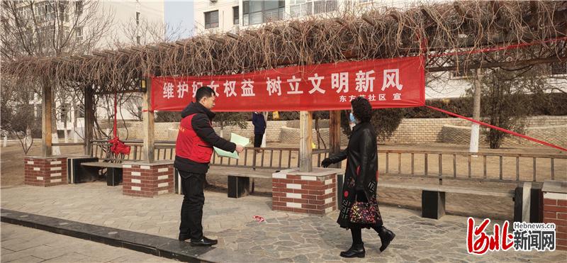 發(fā)出一聲倡議:東方苑社區(qū)采取線上線下相結(jié)合的方式,向轄區(qū)居民發(fā)出“維護(hù)婦女權(quán)益,樹立文明新風(fēng)”的倡議。社區(qū)黨員志愿者積極參與《婦女權(quán)益保護(hù)法》《反家庭暴力法》宣傳活動中。普及相關(guān)法律知識,耐心為居民講解婦女維權(quán)熱點(diǎn)問題,倡議“拒絕家庭暴力,共建和諧家園”。