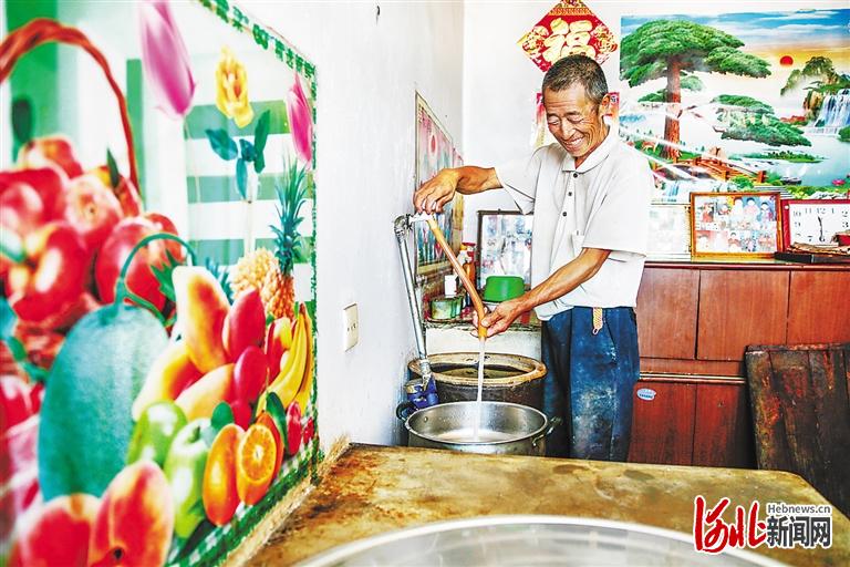 在張北縣郝家營(yíng)鄉(xiāng)三義美行政村東太平自然村,自來(lái)水入戶(hù)后,52歲的村民趙成發(fā)開(kāi)心地取水做飯。(河北日?qǐng)?bào)資料片) 通訊員 李曉寧攝