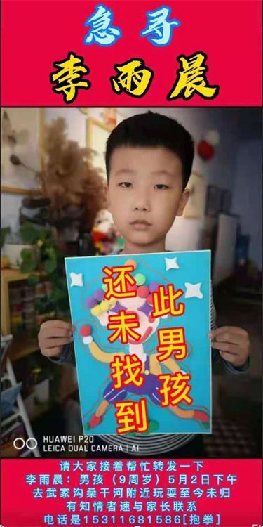 河北新聞網5月7日訊(周穎)河北一9歲男孩走失的信息近日在網上流傳,今天下午筆者聯系上走失男童李雨晨的母親王亞如,她說網絡信息屬實,孩子已走失5天,一直在尋找,目前還沒有任何消息,家人十分著急。