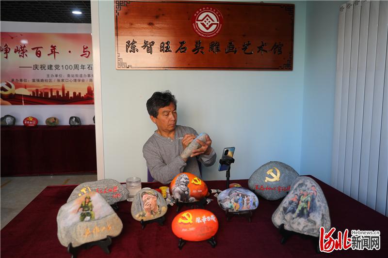 圖為張家口市市級非遺傳承人陳智旺在創(chuàng)作石頭雕畫作品。
