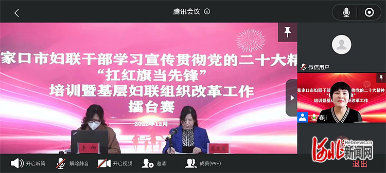 河北網(wǎng)訊(通訊員劉雁霞 河北日報記者劉雅靜)為深入學(xué)習(xí)宣傳貫徹黨的二十大精神,12月26日—28日,張家口市婦聯(lián)利用三天時間在線上舉辦了全市婦聯(lián)干部學(xué)習(xí)宣傳貫徹黨的二十大精神“扛紅旗 當(dāng)先鋒”培訓(xùn)暨基層婦聯(lián)組織改革工作擂臺賽。全市、縣、鄉(xiāng)、村四級婦聯(lián),“四新”領(lǐng)域婦聯(lián)主席,專兼掛職副主席、婦聯(lián)干部、婦聯(lián)執(zhí)委等,共計3000余人參加了此次培訓(xùn)。