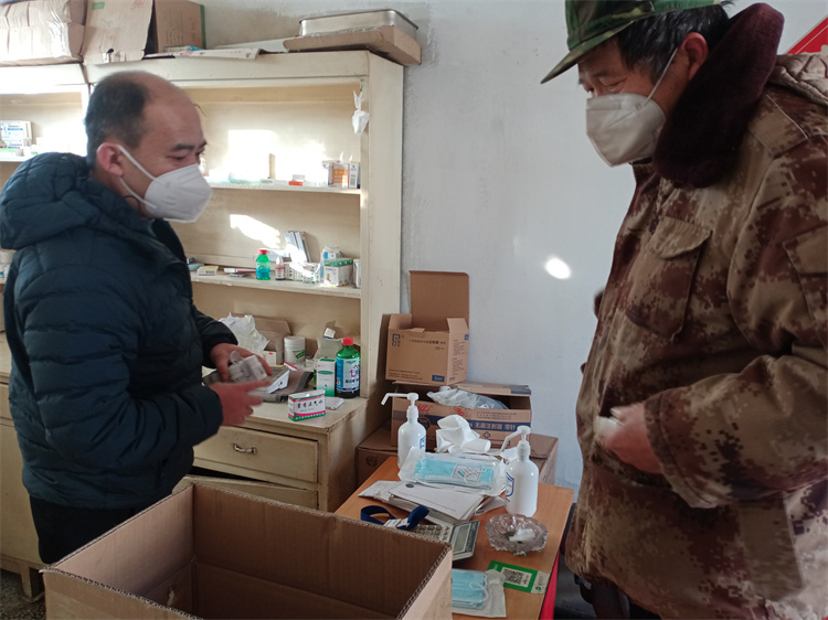12月19日上午,趄柳樹村村醫(yī)王財(左一)為村民免費拿藥。宣化區(qū)委宣傳部供圖