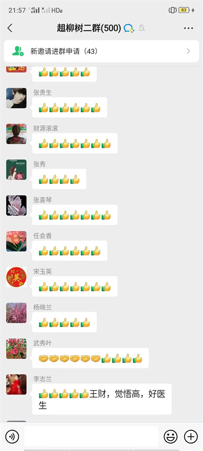 微信群里趄柳樹村村民們對王財夫妻的行為點贊。宣化區(qū)委宣傳部供圖