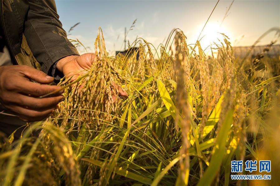 在吉林省舒蘭市平安鎮(zhèn),農(nóng)民在稻田間觀察稻穗灌漿情況(2018年9月18日攝)。