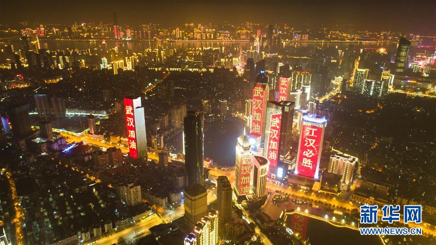 1月31日,武漢市江漢區(qū)西北湖附近高層建筑外墻打出“武漢加油”等字樣(無人機照片)。新華社記者 肖藝九 攝