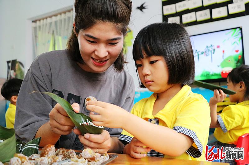 平鄉(xiāng)縣直一幼孩子在老師指導(dǎo)下學(xué)包粽子。