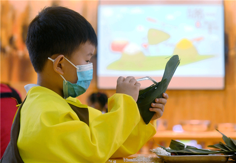 6月10日,石家莊市橋西區(qū)第三幼兒園的小朋友在包粽子。