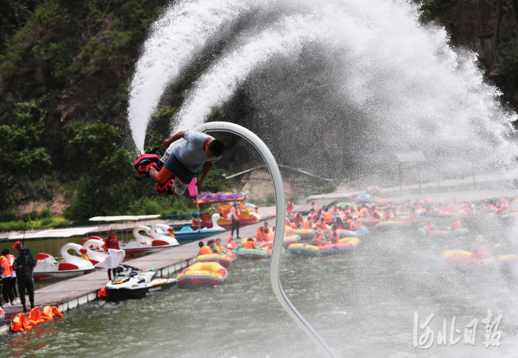 2021年6月12日,秦皇島市海港區(qū)老君頂景區(qū)工作人員為游客表演水上飛人。當(dāng)日是端午小長(zhǎng)假第一天,在位于秦皇島市海港區(qū)石門(mén)寨鎮(zhèn)房莊村的老君頂景區(qū),眾多游客來(lái)到這里體驗(yàn)觀賞水上項(xiàng)目,樂(lè)享休閑假日。 通訊員 曹建雄 攝影報(bào)道
