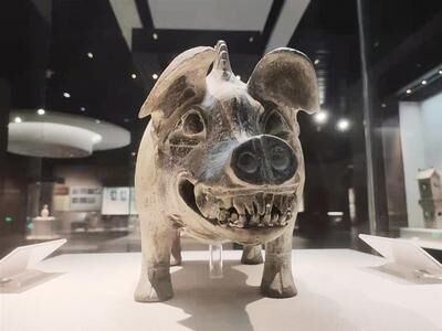 這件文物是1951年從滄縣一座漢墓中出土的。長(zhǎng)38.5厘米,高24.2厘米。從正面看,這只陶豬很像是現(xiàn)在的野豬:鬃毛長(zhǎng)且直立、耳朵前立、鼻子長(zhǎng),而且又長(zhǎng)著獠牙?傻絺(cè)面一看,這只陶豬明顯又是家豬的模樣:圓滾滾、胖乎乎,膘肥體壯。王瑋說(shuō),這很可能就印證了在那個(gè)時(shí)代里,野豬正處于向家豬馴化過(guò)程中。