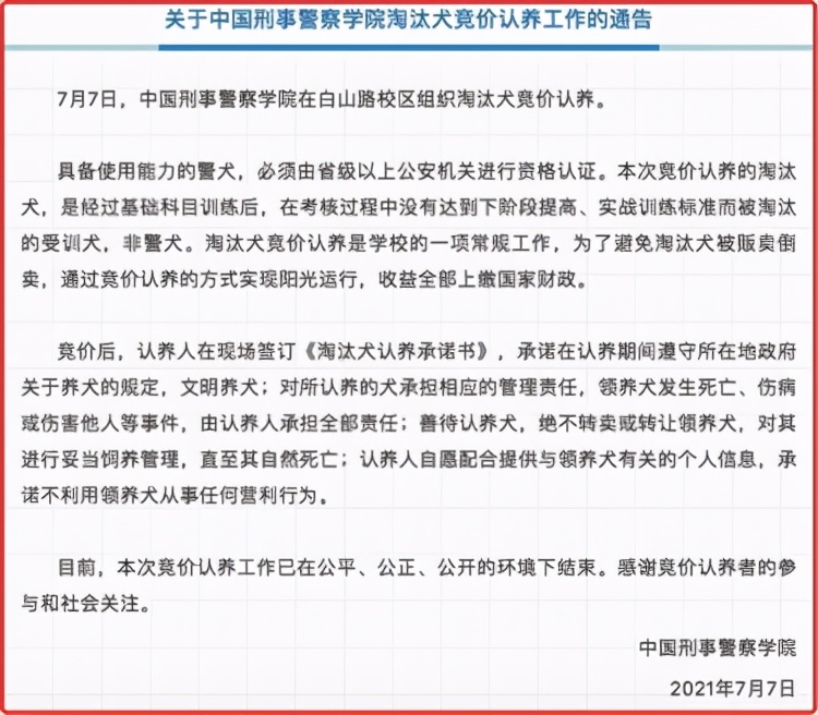 而這場拍賣會(huì)的舉行,還要從6月22日中國刑事警察學(xué)院官網(wǎng)發(fā)布的《淘汰犬出售公告》說起。