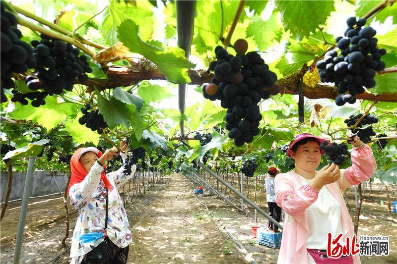 7月14日,懷來(lái)縣土木鎮(zhèn)西辛堡村村民朱建平、李淑萍在葡萄園里采摘葡萄。 通訊員孫慧軍攝