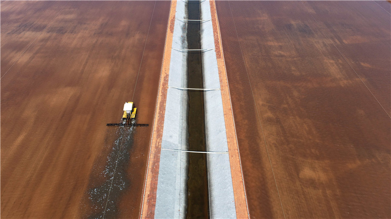7月19日,在唐山海港經(jīng)濟(jì)開發(fā)區(qū)長蘆大清河鹽場,工人在結(jié)晶池操作機(jī)械設(shè)備進(jìn)行作業(yè)(無人機(jī)照片)。