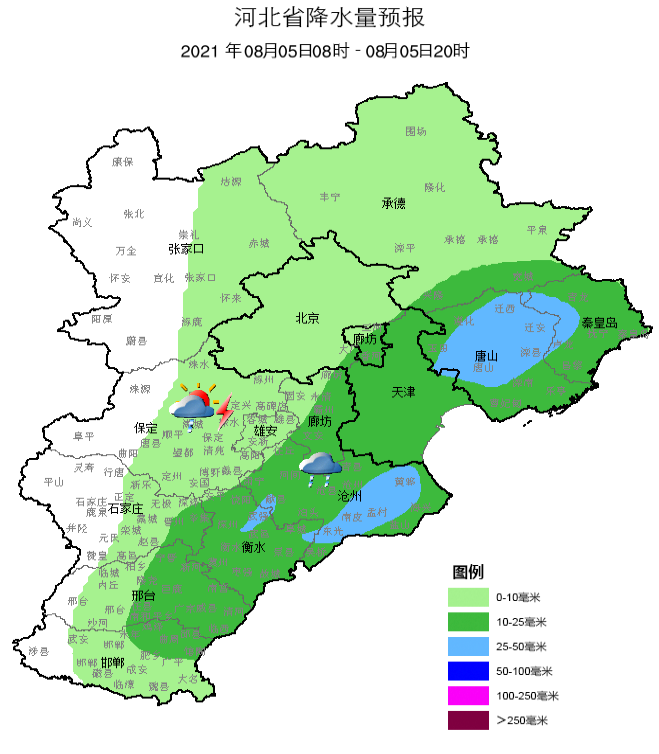 明天(8月5日)白天,全省多云間陰,大部分地區(qū)有雷陣雨或陣雨,其中承德東部、唐山、秦皇島、廊坊、滄州、衡水局地有中到大雨,個(gè)別地點(diǎn)有暴雨,雷雨時(shí)局地伴有短時(shí)大風(fēng)、短時(shí)強(qiáng)降水等強(qiáng)對(duì)流天氣。