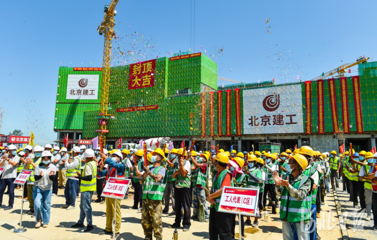 2021年8月2日,施工人員代表慶祝雄安宣武醫(yī)院工程主體封頂。