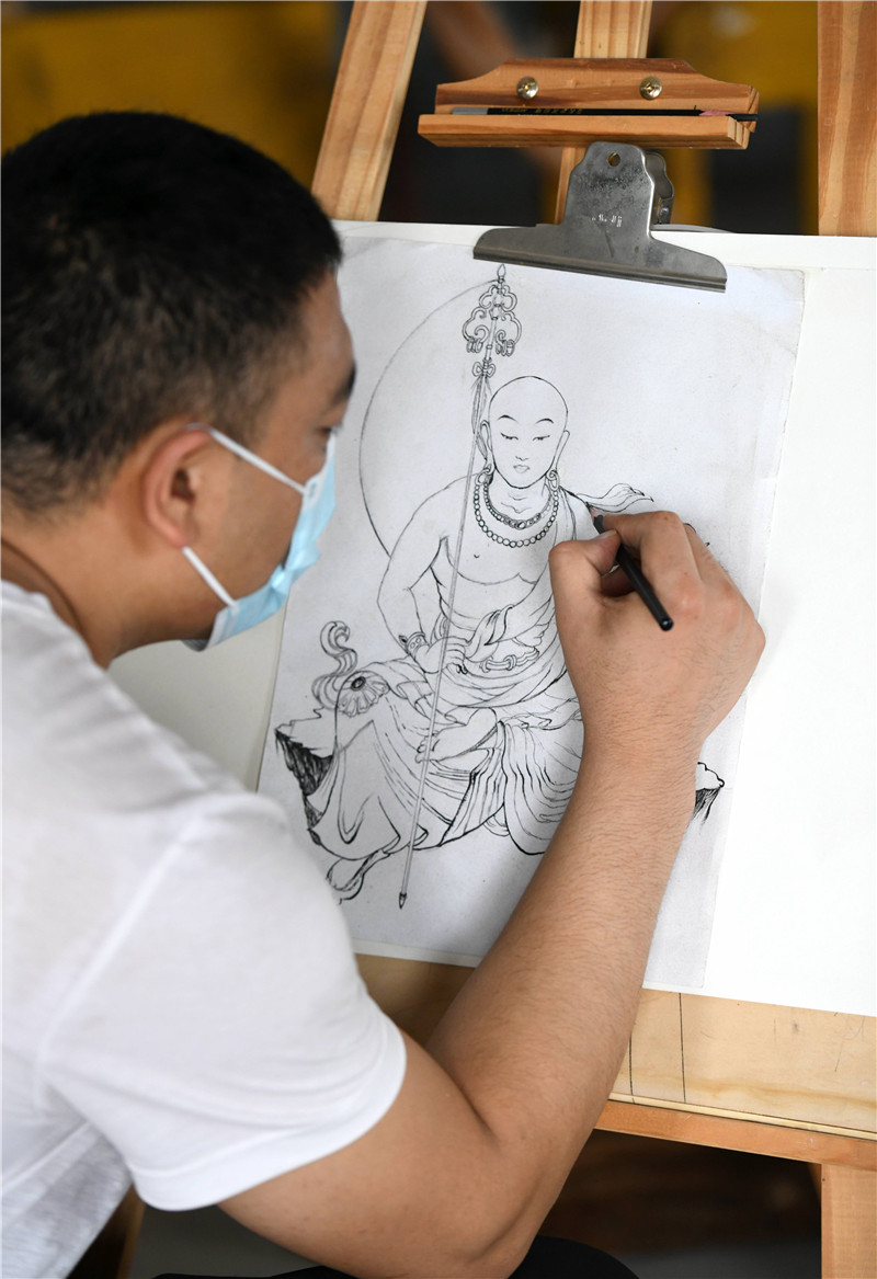 8月11日,許紅陽在河北省井陘縣小作鎮(zhèn)許氏木雕工作室畫圖。