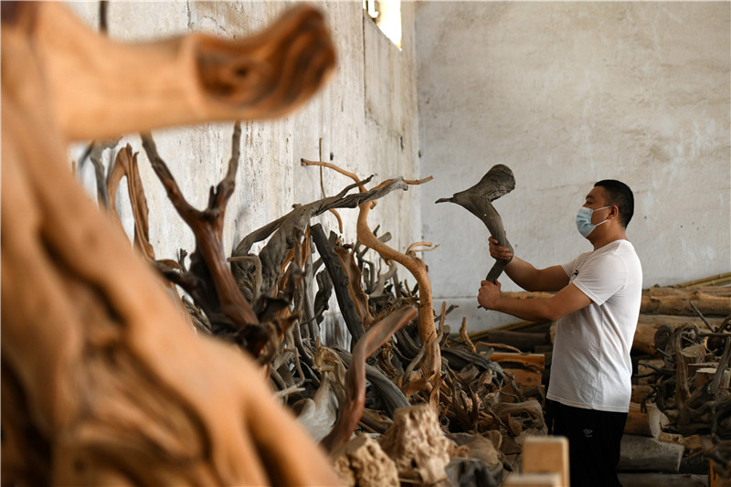 8月11日,許紅陽在河北省井陘縣小作鎮(zhèn)許氏木雕工作室選料。