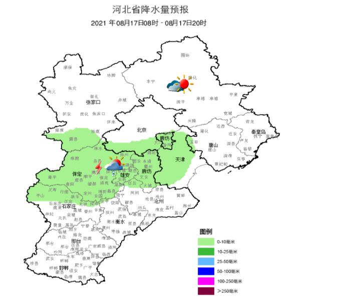 明天(8月17日)白天,張家口南部、保定、雄安新區(qū)、廊坊、石家莊北部多云間陰有分散性雷陣雨或陣雨,其他地區(qū)多云間晴。