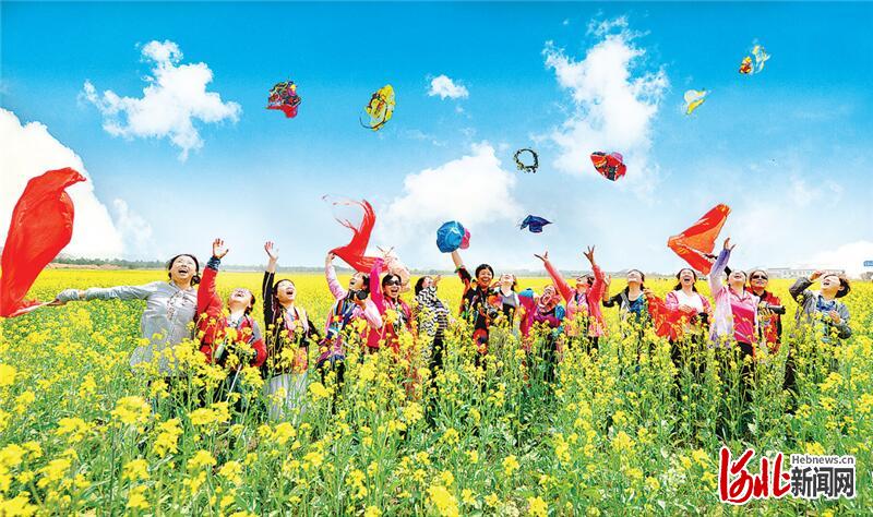 在豐寧滿族自治縣大灘鎮(zhèn),游客們興致勃勃地在油菜花花海中游玩。