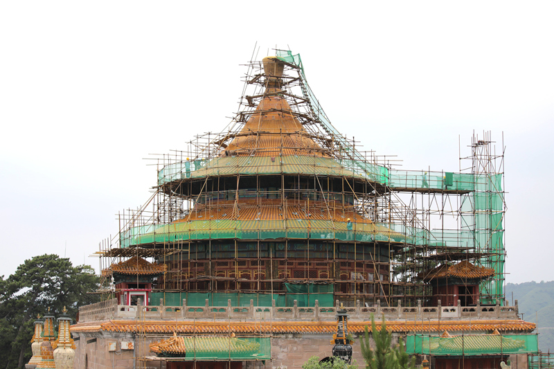 6月9日,工人在河北省承德市普樂寺旭光閣進行修繕施工。
