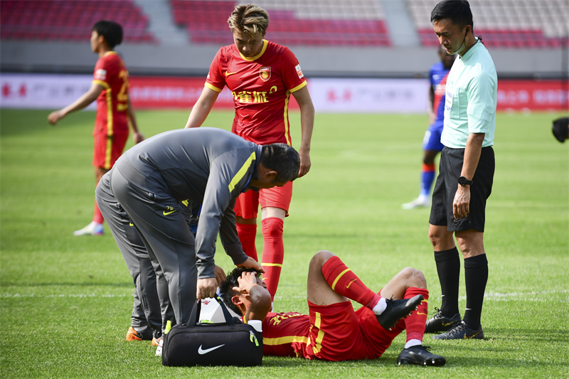 6月16日,主裁判唐順齊(右)查看河北隊球員楊辰禹(下)的傷勢。新華社記者 王乙杰 攝