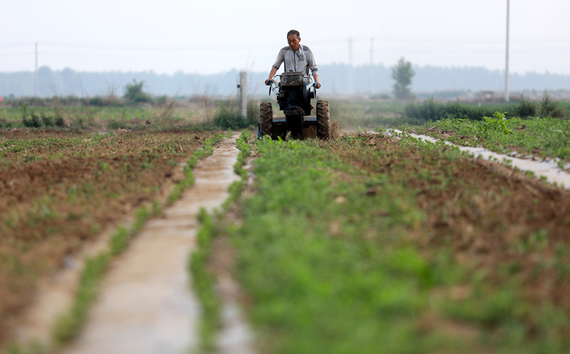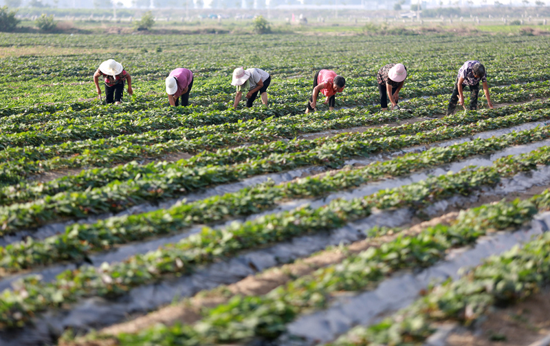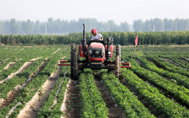 6月21日,農(nóng)民在石家莊市行唐縣南橋鎮(zhèn)東安太莊村紅薯種植基地除草。新華社記者 駱學峰 攝