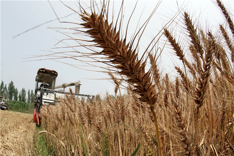 6月19日,遵化市劉備寨鄉(xiāng)的農(nóng)民駕駛農(nóng)機收割小麥。
