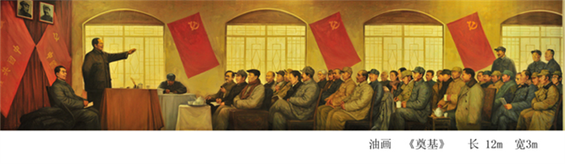 長12米,寬3米,采用寫實手法和中國傳統(tǒng)的散點透視構圖,再現(xiàn)中國共產(chǎn)黨七屆二中全會會議場景,色彩沉穩(wěn),氣勢磅礴。由河北美術學院創(chuàng)作的這幅大型油畫《奠基》被西柏坡紀念館收藏。