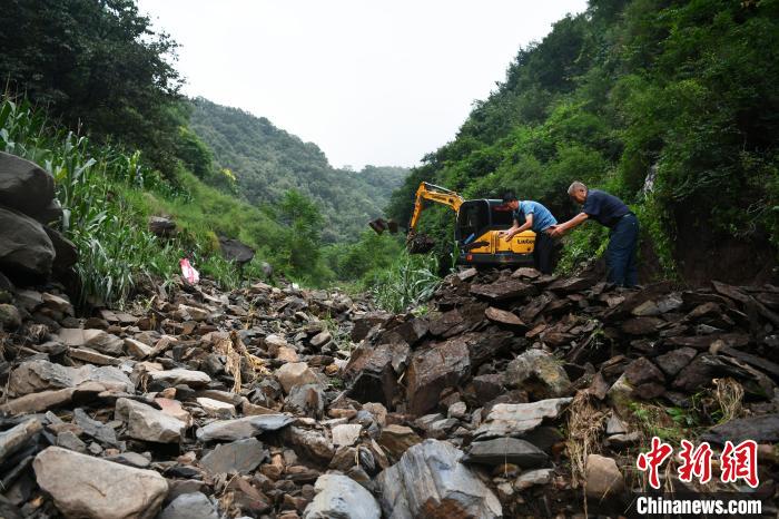 8月9日,河北省邢臺市臨城縣趙莊鄉(xiāng)梁家莊村一條正在修復(fù)的田間道路,村民自發(fā)在該路段清理碎石。 中新社記者 翟羽佳 攝