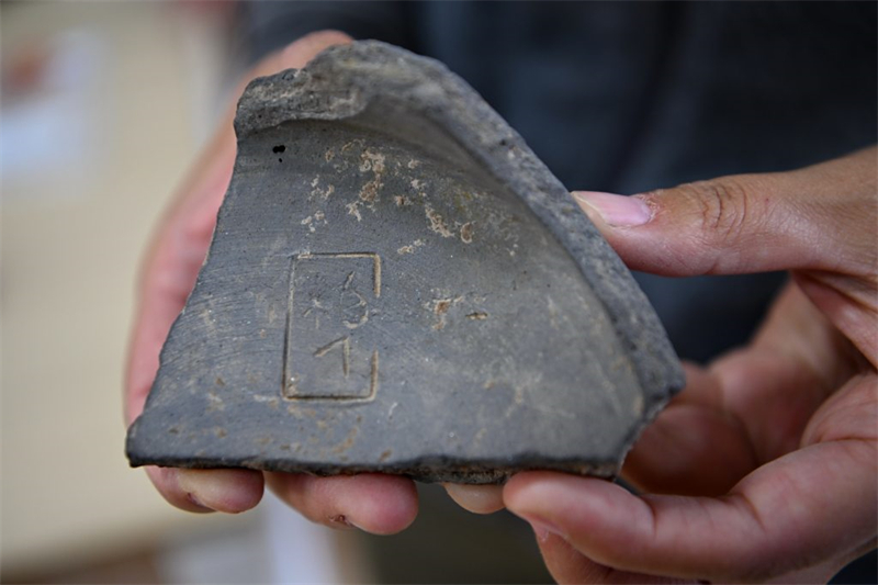 10月8日,考古隊員展示柏人城遺址出土的帶有文字的陶片。新華社記者牟宇攝