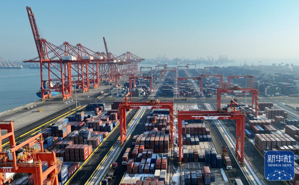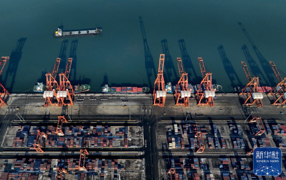 12月28日拍攝的唐山港京唐港區(qū)集裝箱碼頭堆場(無人機照片)。