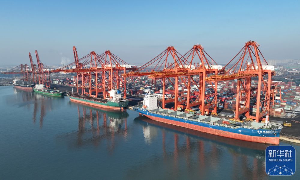 12月28日,多艘輪船靠泊在唐山港京唐港區(qū)集裝箱碼頭裝貨(無人機照片)。